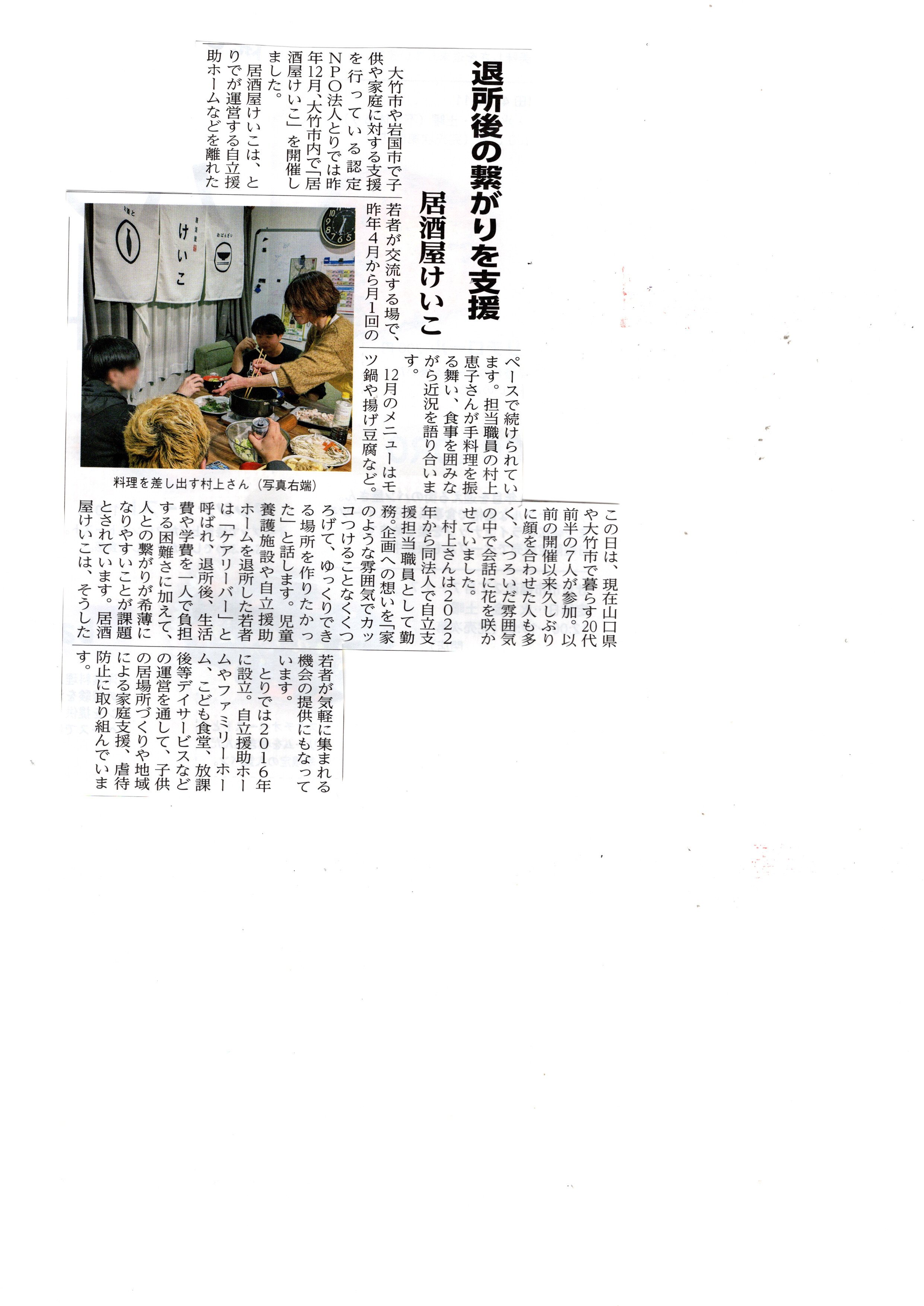・令和4年4月20日(水) 中国新聞【山口版】(退所児童等アフターケア事務所こたつ)画像